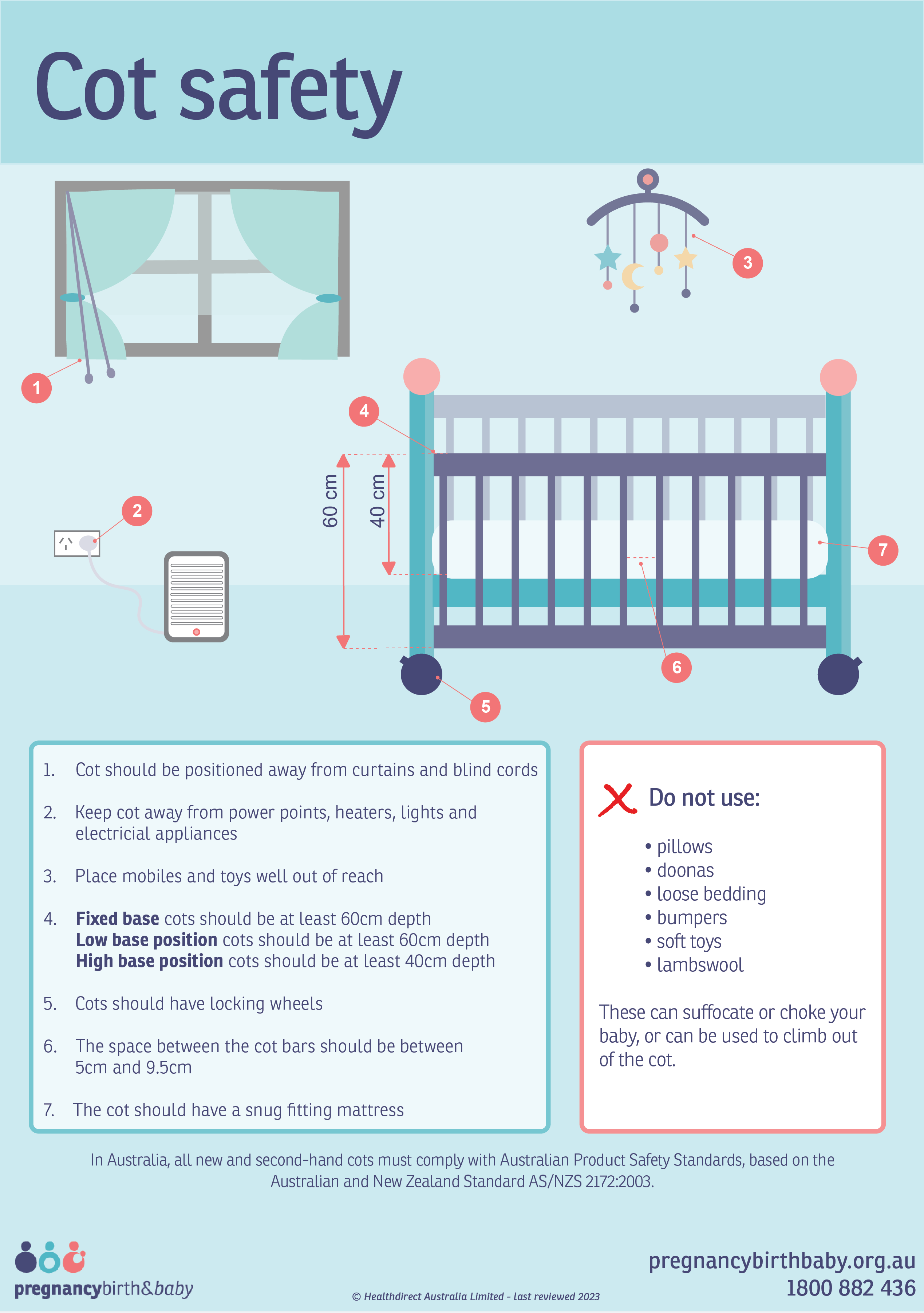 The safest place for a baby to sleep is in a safe cot which meets the current Australian Standard AS/NZS2172-2010, on a safe mattress which is firm, clean, flat and the right size for the cot. It’s also important to make sure the bedding is safe and there is no bulky bedding in the cot.