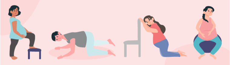 There are a number of positions you can try when you are in labour to help ease pain and aid in opening your pelvis for a smoother birth.