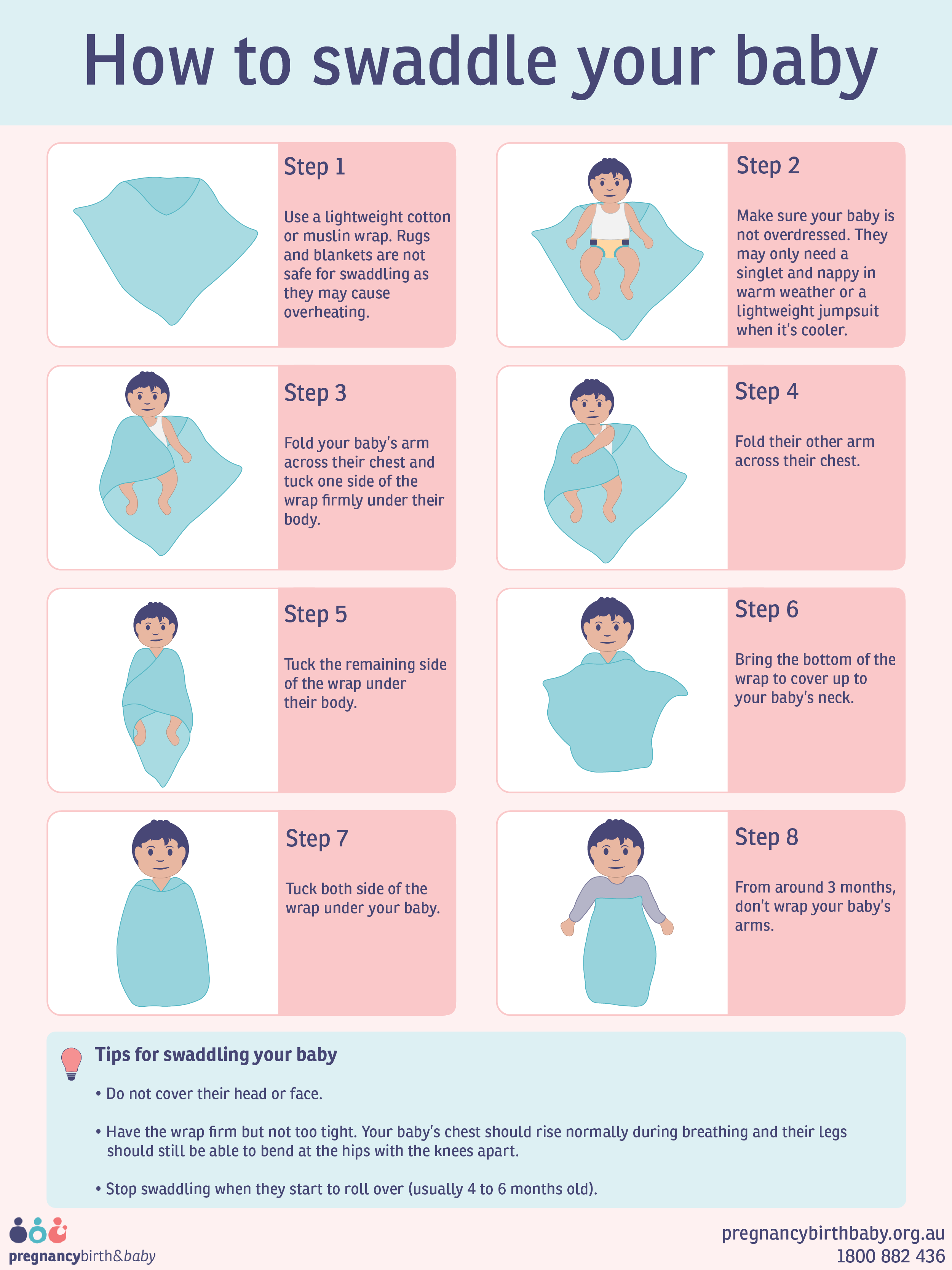 - Ensure that your baby is on their back with their feet at the bottom of the cot. Do not cover your baby’s head or their face. This is to stop the wrap from blocking their breathing and overheating them.